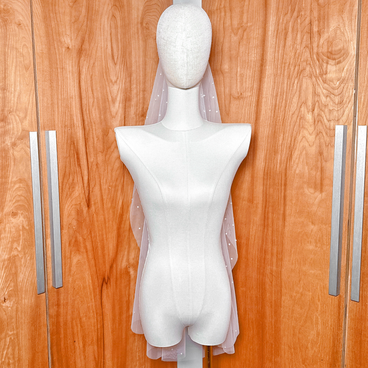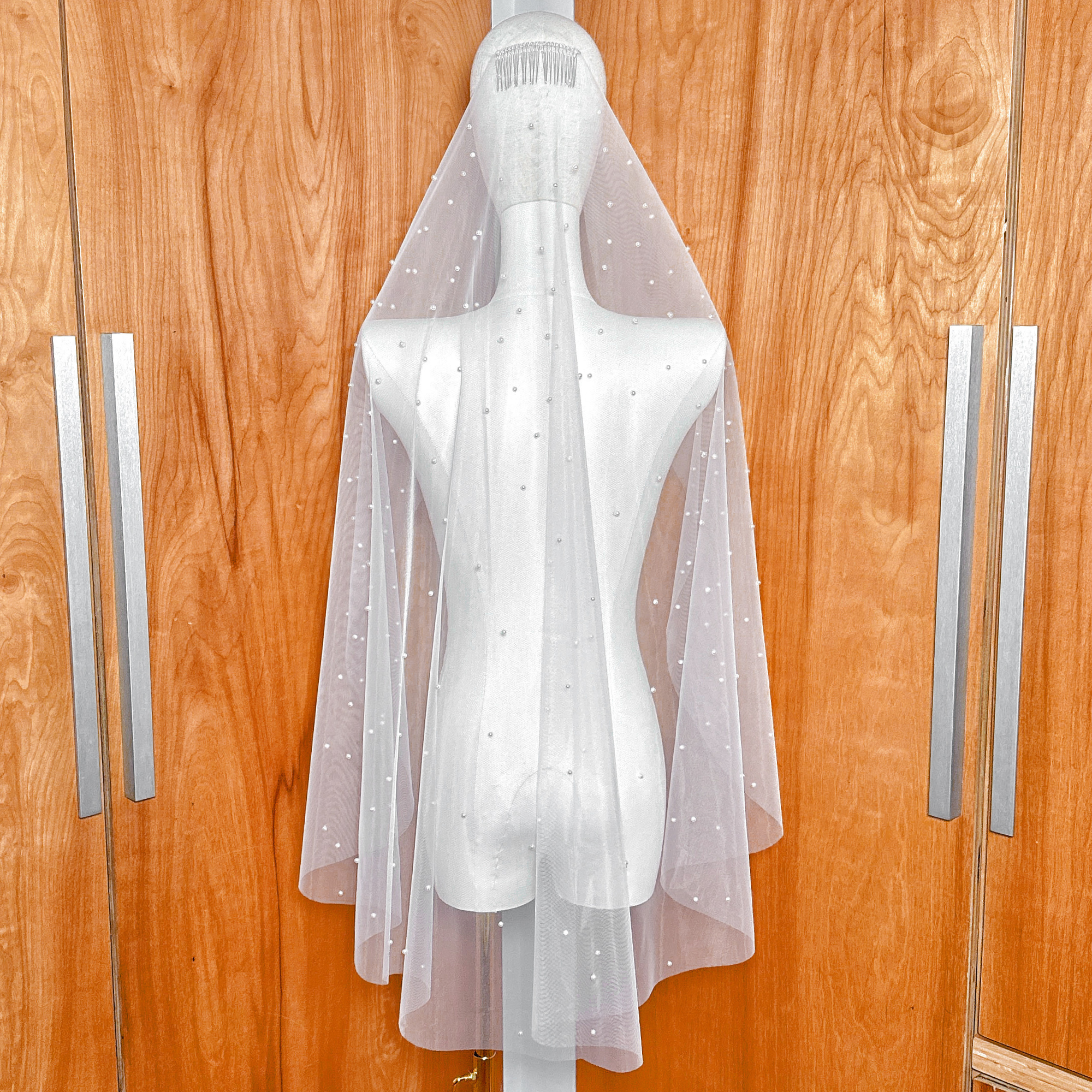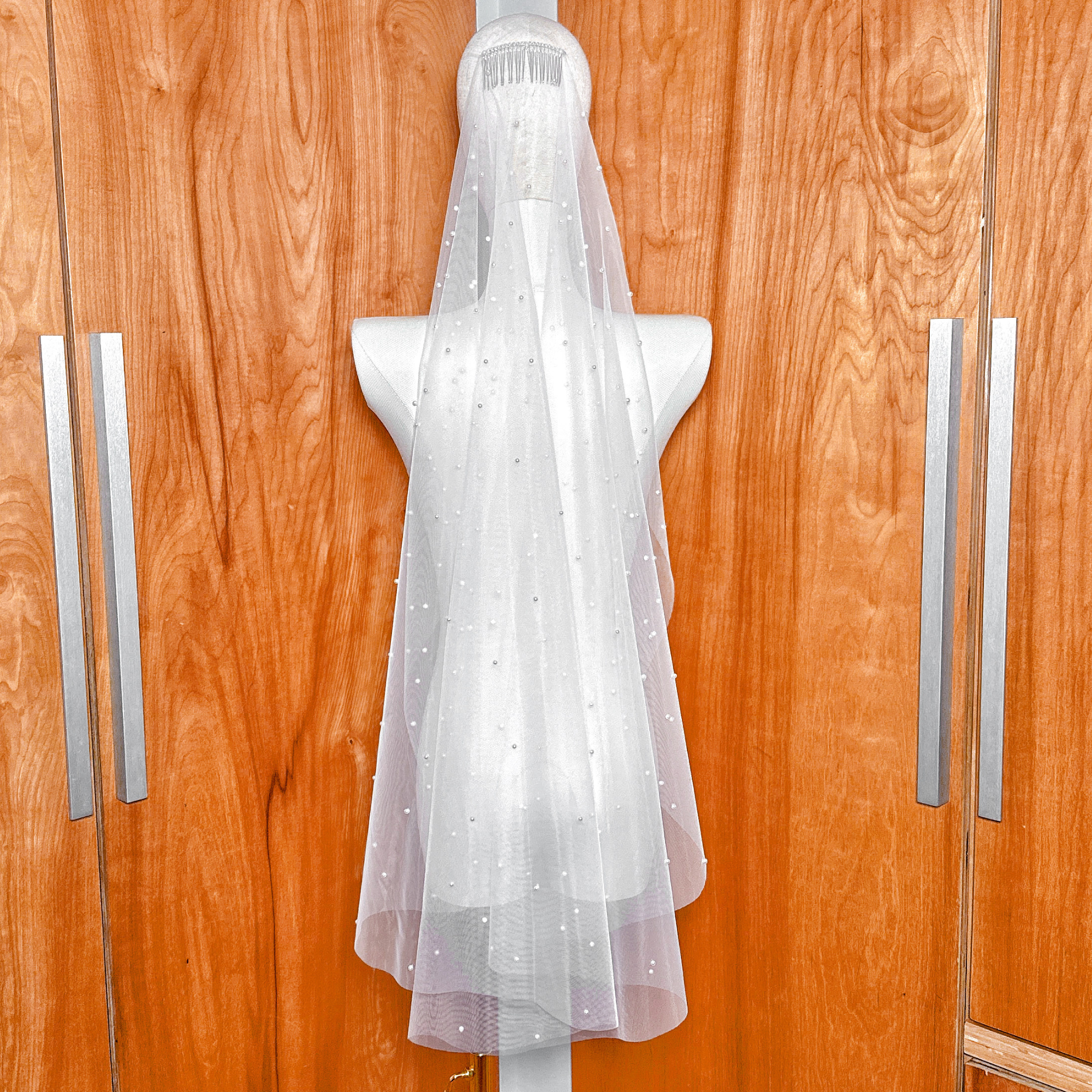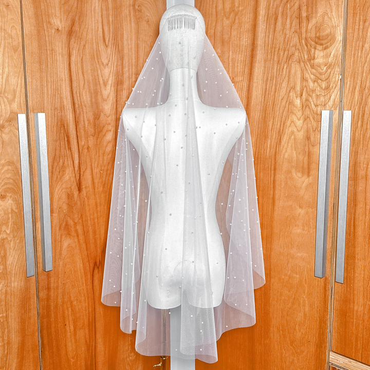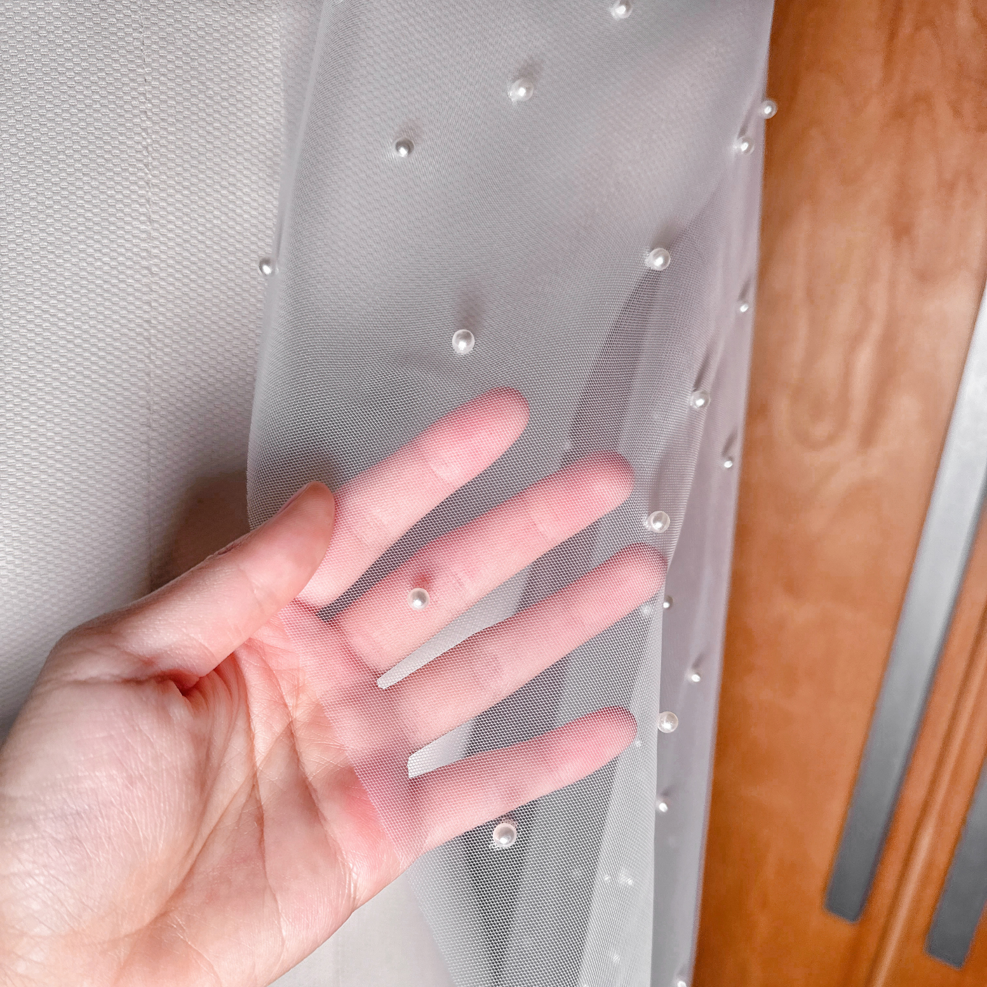 Crafted from luxuriously soft tulle, Mila features a generous burst of delicate pearls that gracefully stop at waist length. The bottom edge is lightly embellished, allowing your beautiful dress to shine through completely while creating a subtle, enchanting shimmer that catches the light with your every movement. 🤍