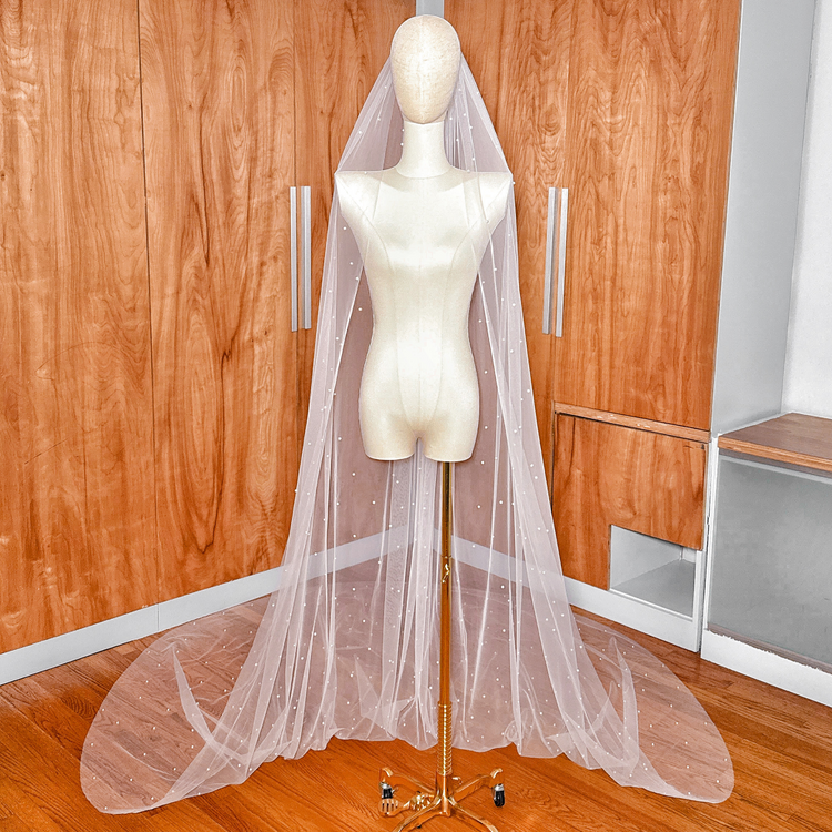 Our Rosie pearl cathedral veil is a breathtaking masterpiece that perfectly balances sophistication with modern romance. Delicately adorned with hundreds of hand-placed pearls that shimmer with every gentle movement, this stunning creation captures and reflects light in the most magical way.